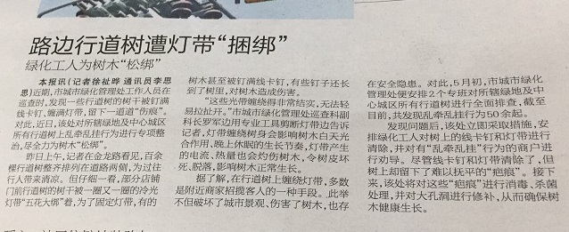 路邊行道樹(shù)遭燈帶“捆綁” 綠化工人為樹(shù)木“松綁”